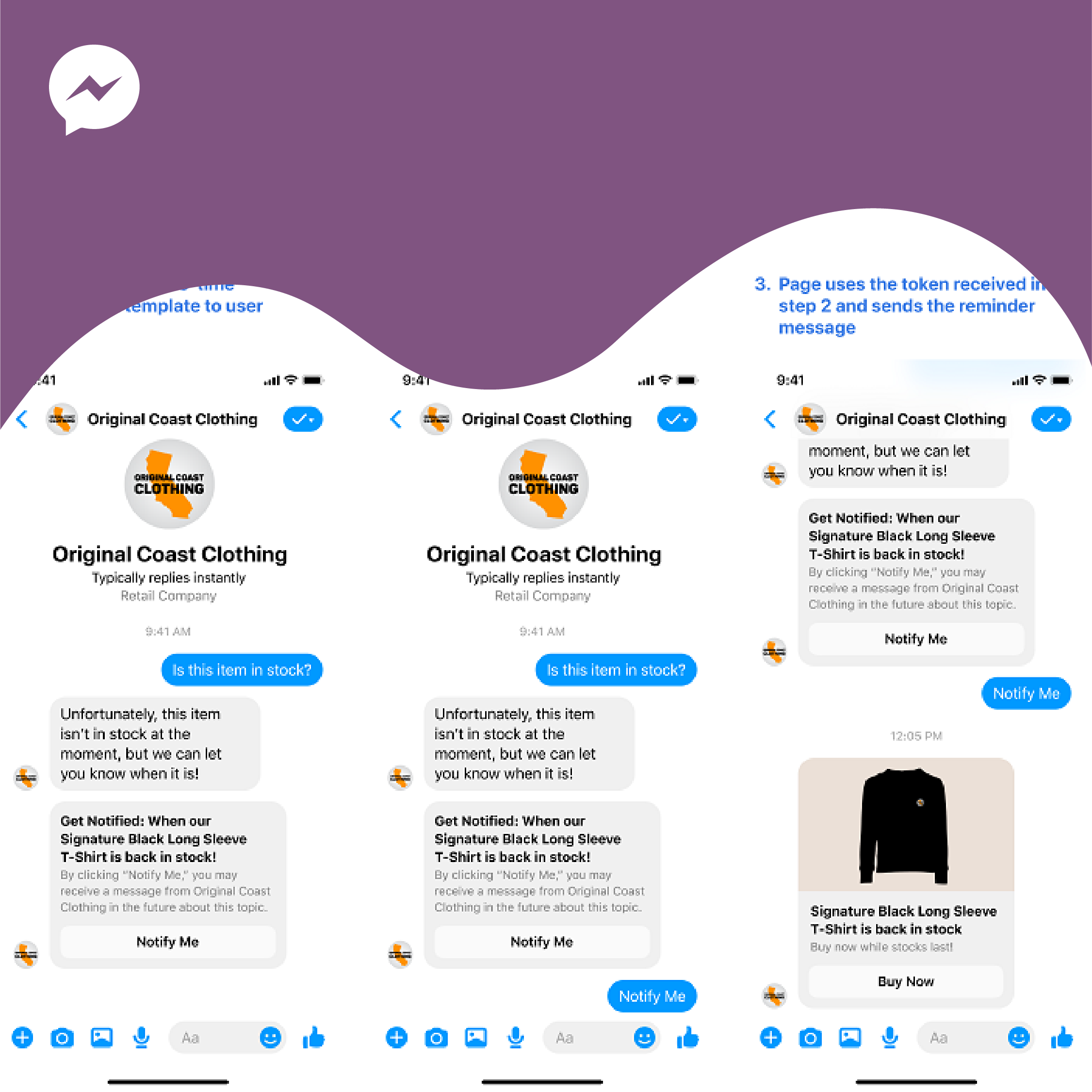 “Businesses can send a message to the user asking if they want to be notified on a topic. If the user asks to be notified, the business receives a token and can use this token to send out the notification with the information the user requested at a later time.”