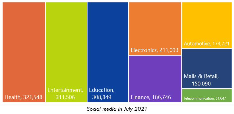 Between July 1-31, 2021, the top three most discussed topics were health, education, and entertainment in that order, followed by electronics, finance, and malls & retail.